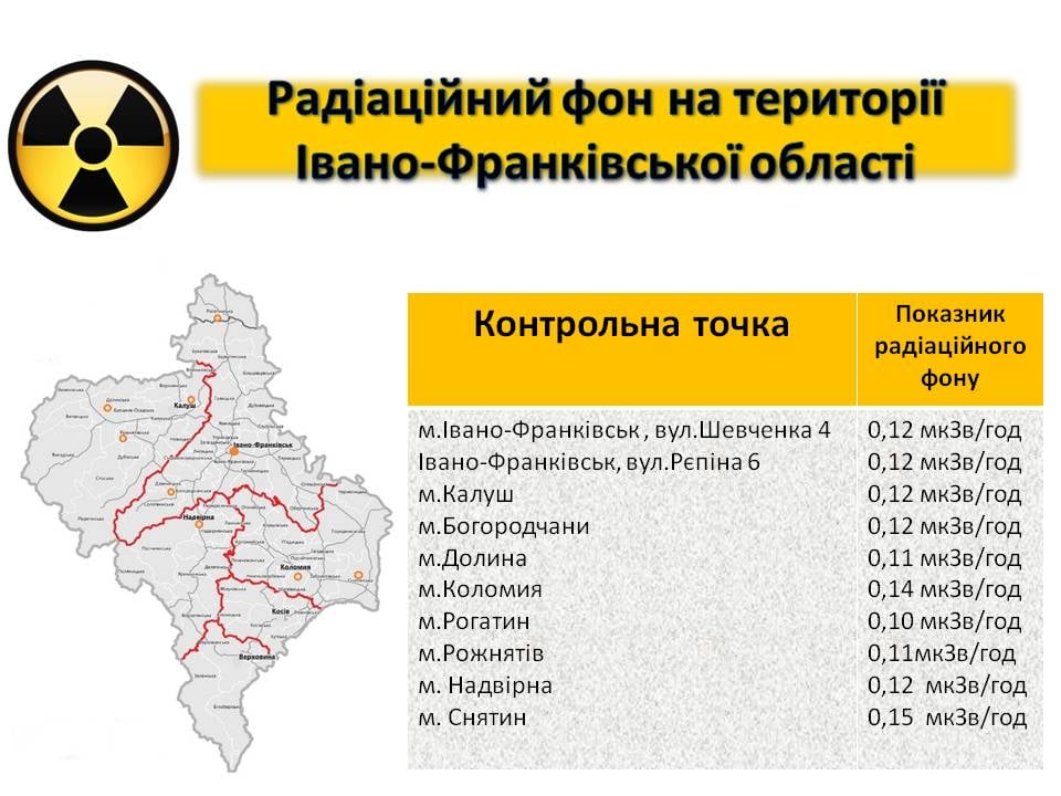 Станом на сьогодні, 4 квітня, показник радіаційного фону в Івано-Франківській області становить від 0,10 до 0,15 мкЗв/год.