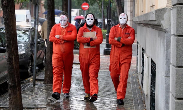 Троє членів громадського об'єднання "Мадрид без майбутнього" у масках з проханням підтримати ресторанний та барний сектори. Фотографія: Родріго Хіменес / EPA