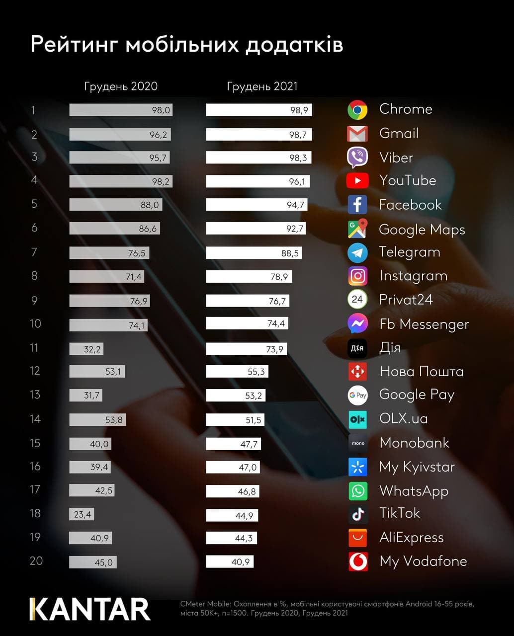 Компанія проводила дослідження серед користувачів смартфонів з операційною системою Android віком 16 – 55 років у містах з населенням 50 тисяч мешканців і більше. Загалом опитали 1,5 тисячі користувачів.